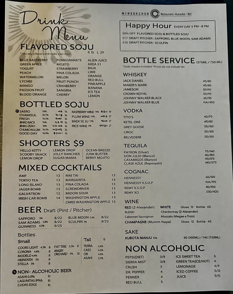 Overall, Min Sok Chon provides a memorable dining experience with its karaoke rooms, tasty cocktails, and friendly service. If you're a fan of Korean cuisine, this is definitely a spot worth checking out."