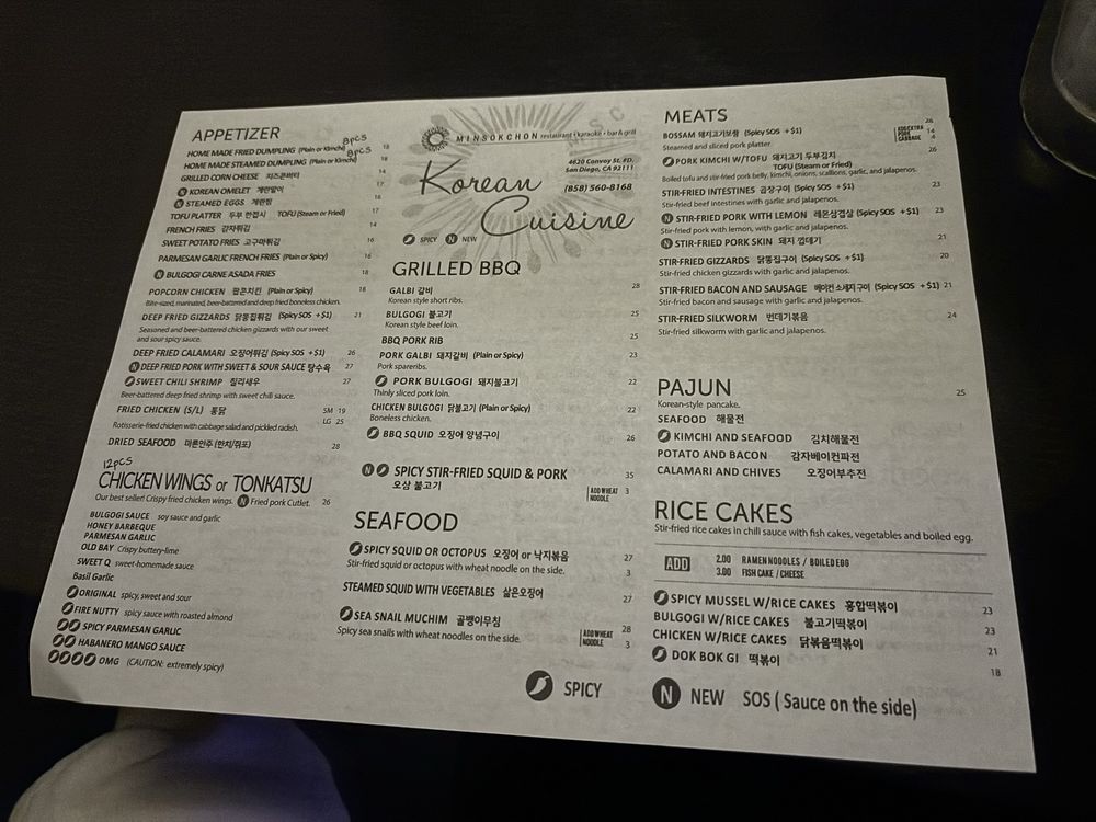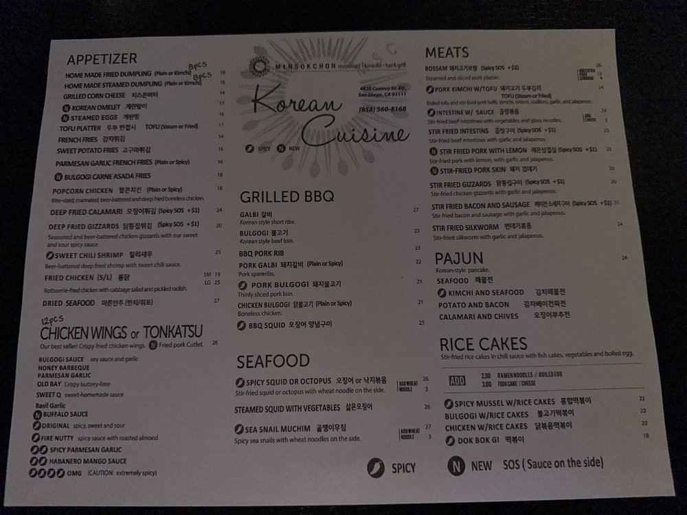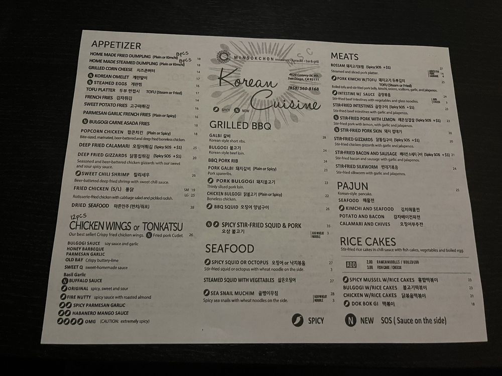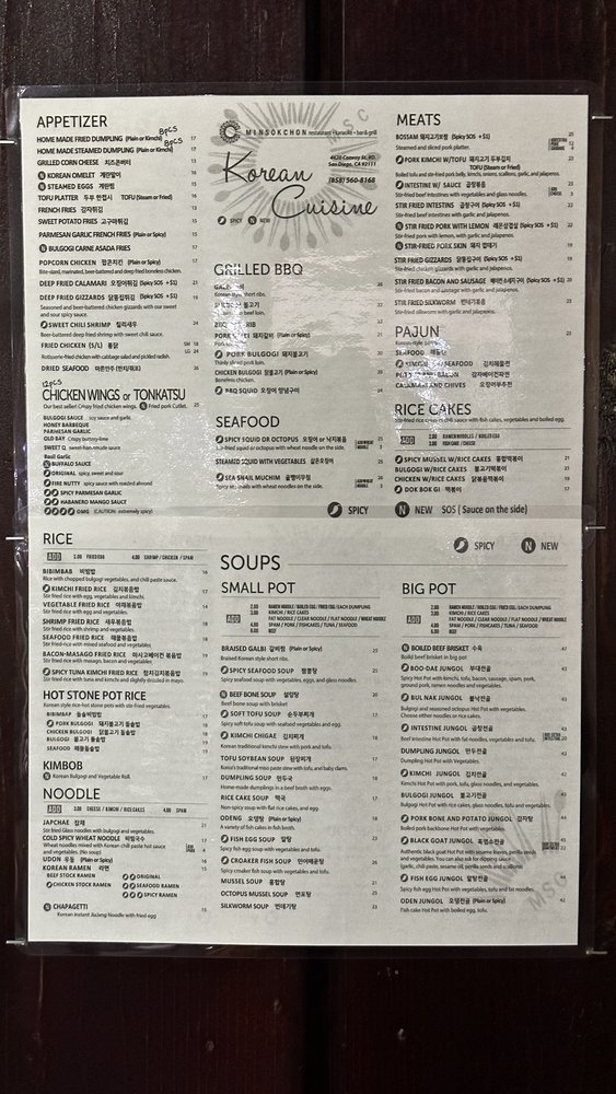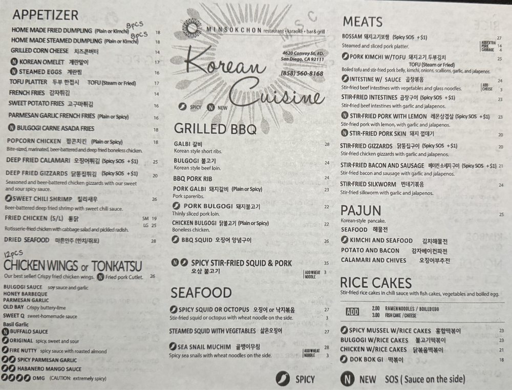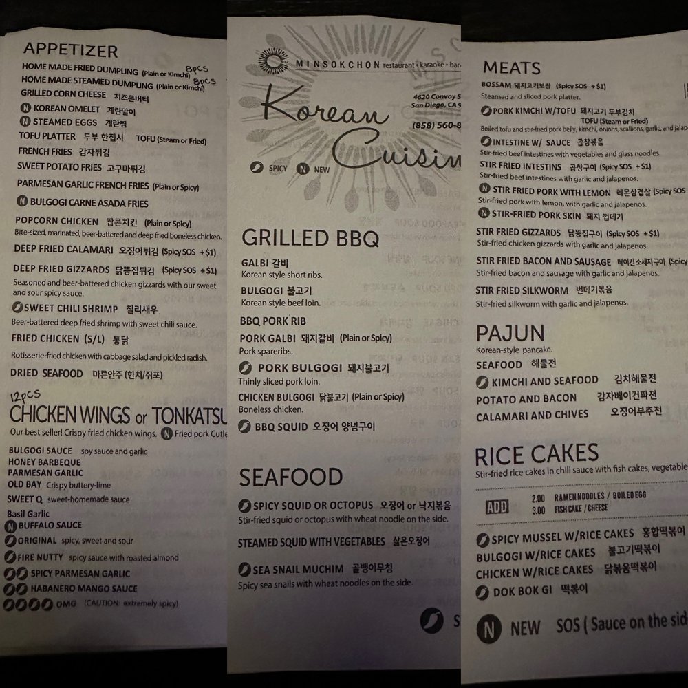 "Introducing the menu at Min Sok Chon, a lively Korean restaurant in San Diego. With a unique blend of traditional dishes and modern twists, Min Sok Chon offers a variety of options for every palate. From the popular Hea Mul Pajun Korean pancake to the flavorful Bul Nak Jungol soup, each dish is crafted with care and attention to detail.